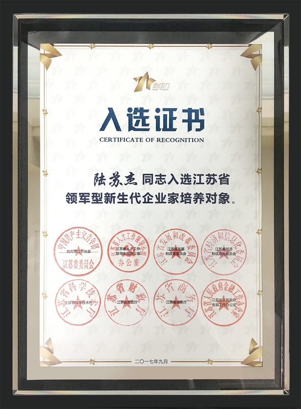 9月14日,江蘇省新生代企業(yè)家培養(yǎng)“新動力”計劃啟動儀式在南京舉行。江蘇省新生代企業(yè)家培養(yǎng)“新動力”計劃是共青團江蘇省委、江蘇省人才工作領(lǐng)導小組辦公室、江蘇省發(fā)展和改革委員會、江蘇省經(jīng)濟和信息化委員會、江蘇省科技廳、江蘇省財政廳、江蘇省商務廳和江蘇省人民政府金融工作辦公室聯(lián)合組織的,以培養(yǎng)和建設一支政治上有方向、發(fā)展上有本事、責任上有擔當、文化上有內(nèi)涵的新生代企業(yè)家隊伍。通過組織推薦、專家評審、審核確定等程序,在全省遴選200名領(lǐng)軍型、800名新銳型新生代企業(yè)家,頒發(fā)證書,并建立千名新生代企業(yè)家英才庫,使之成為“蘇商精神的傳承者、民營經(jīng)濟的接力者、創(chuàng)新發(fā)展的先行者、現(xiàn)代企業(yè)的領(lǐng)跑者” 。公司陸蘇杰入選江蘇省領(lǐng)軍型新生代企業(yè)家培養(yǎng)對象。