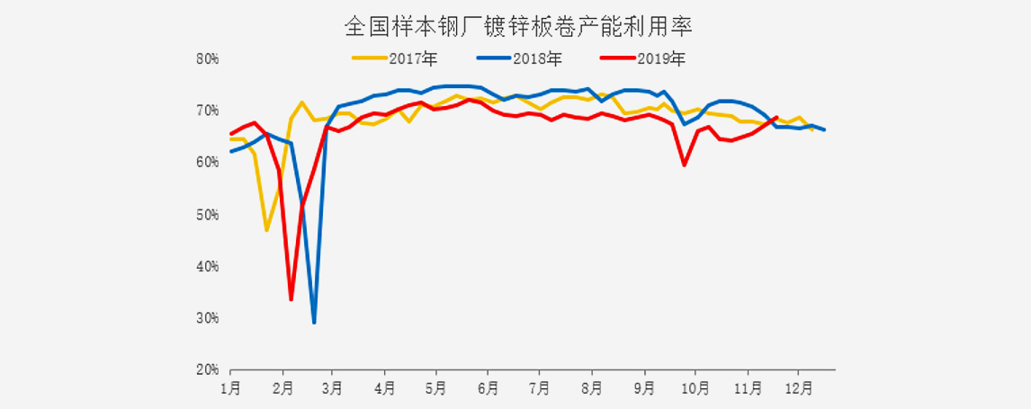 從工廠生產(chǎn)情況了解,最新同口徑樣本鍍鋅板卷企業(yè)產(chǎn)能利用率僅為68.66%,相對好于去年同期的66.76%,看得出,生產(chǎn)積極性狀態(tài)有所回升。一方面,前三季度整體需求不及預期,整體開工及達產(chǎn)情況偏低;另一方面,11月價格上漲,推動廠商積極性提升。從整個運行趨勢來看,預計12月或繼續(xù)好于去年同期水平。